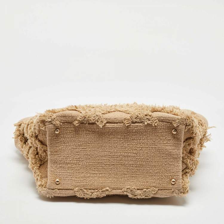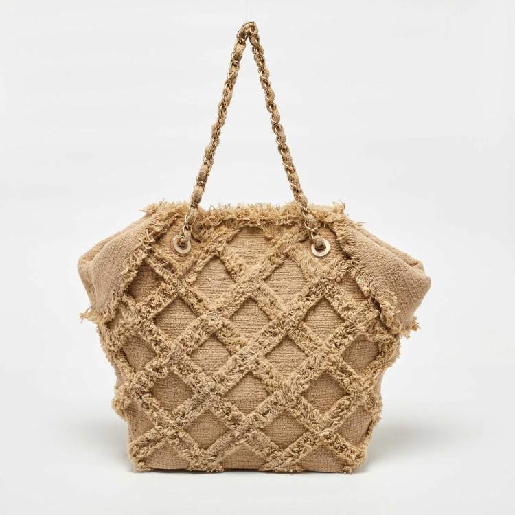 This Chanel Beige Diamond Stitch Tweed CC Nature Tote Bag is a unique and eye-catching addition to any luxury collection. Crafted from soft tweed with a bold CC logo and fringe detail, this piece blends casual elegance with iconic Chanel craftsmanship.