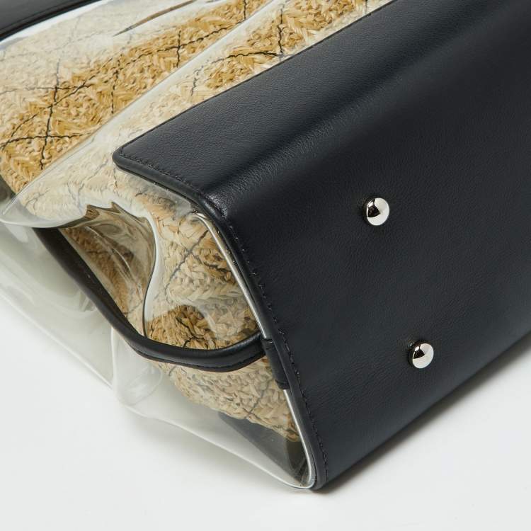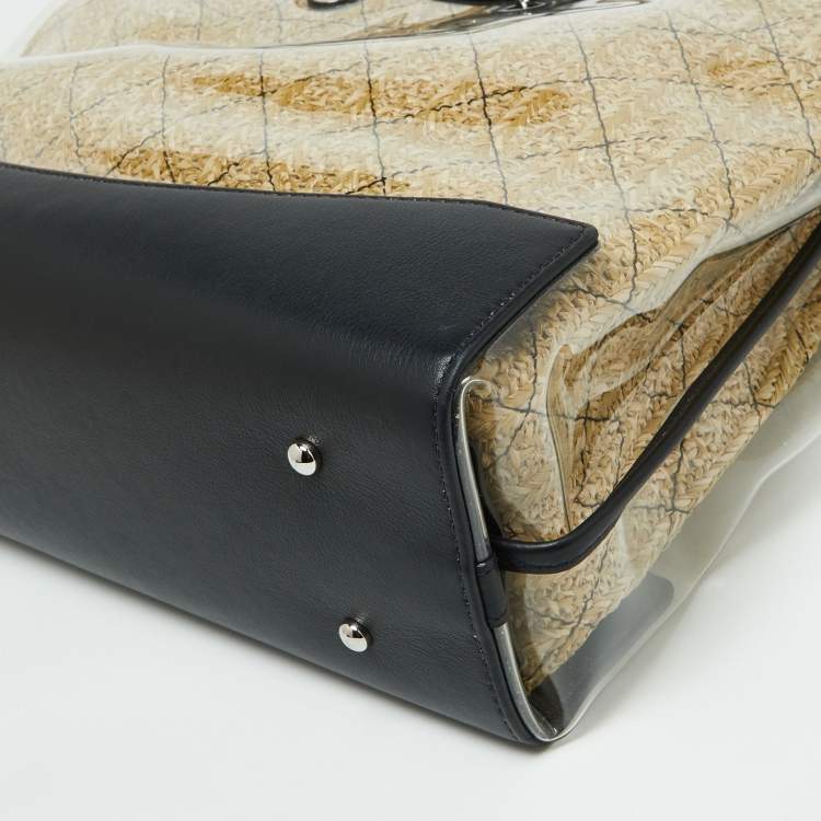 Authentic Chanel 31 Shopping Bag in black leather and clear PVC with gold-tone quilted interior panel. This standout piece is in excellent condition with only negligible scuffs on the exterior and lining, along with minor hairline scratches on the metal hardware.