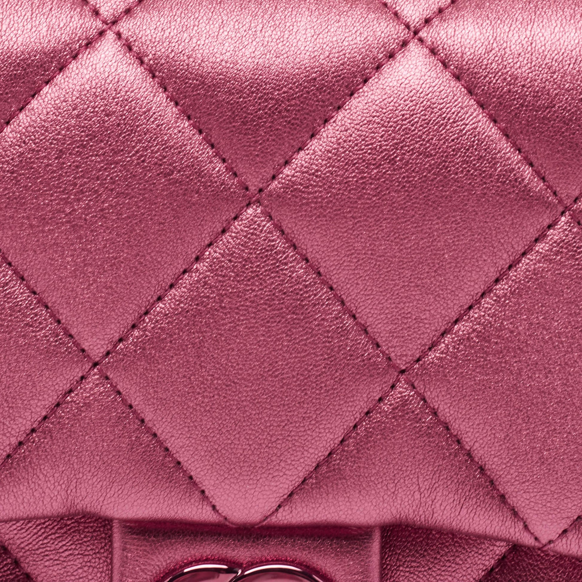 A showstopping collectible, this Chanel Mini Flap Bag is crafted in striking metallic pink quilted leather and features matching pink-tone chain hardware with the classic CC closure. Its compact structure and rare finish make it a standout for any fashion-forward collection.