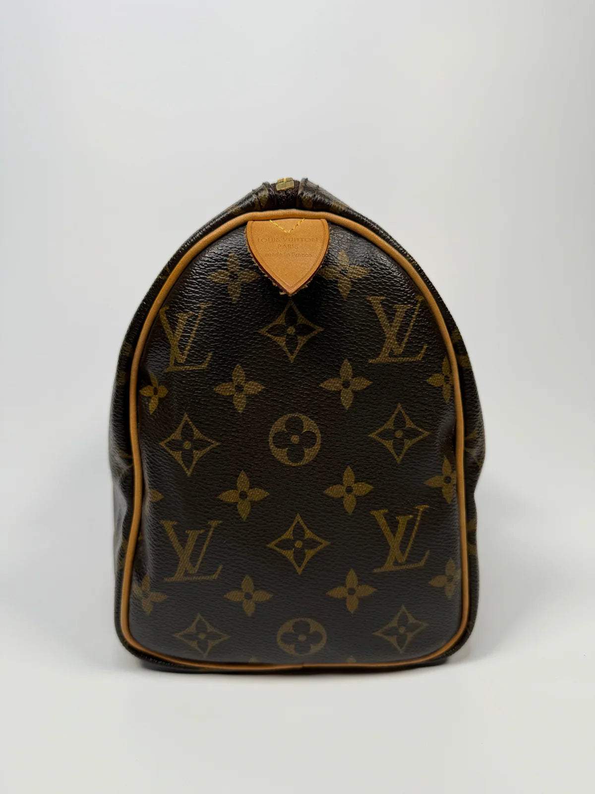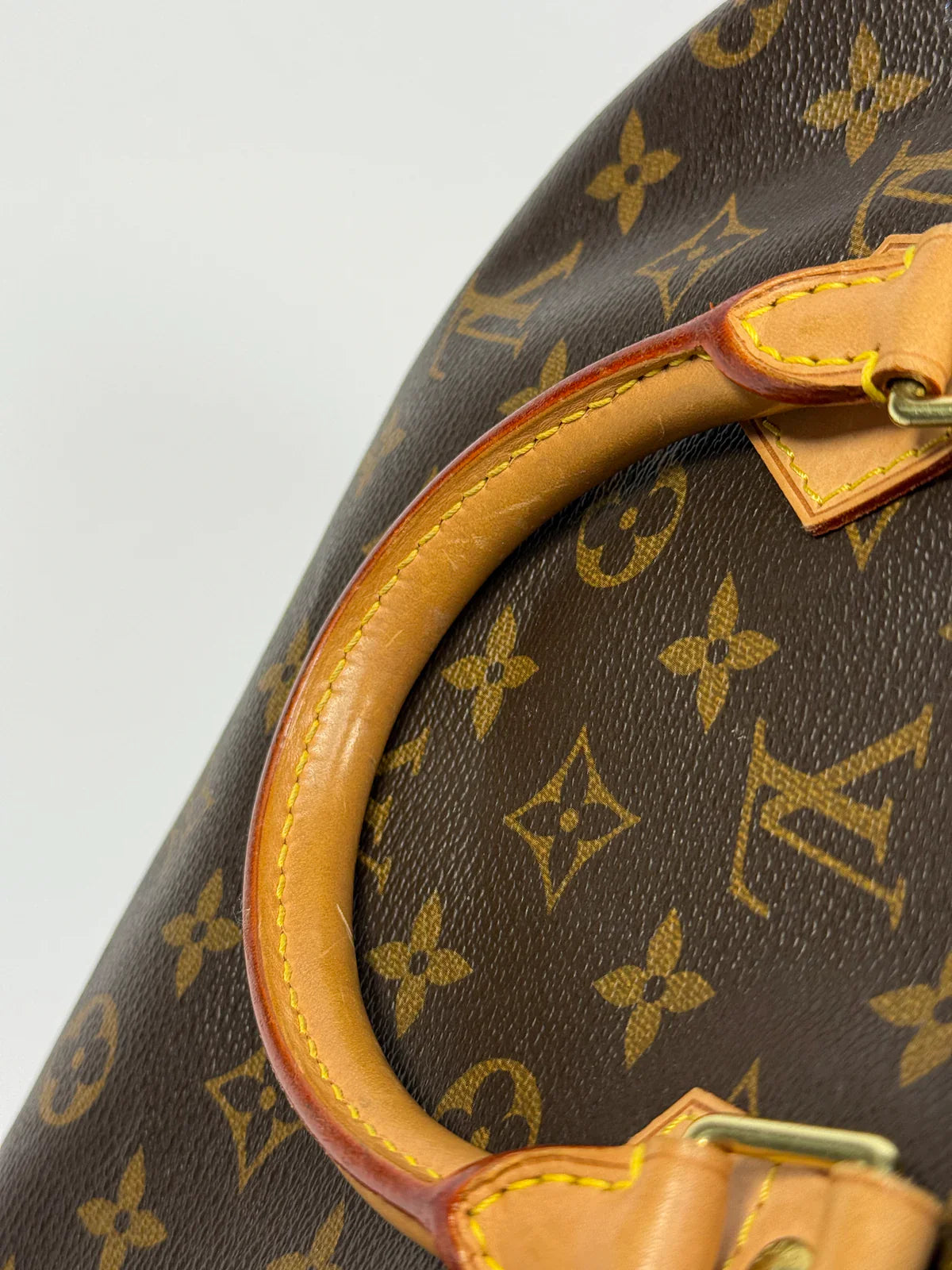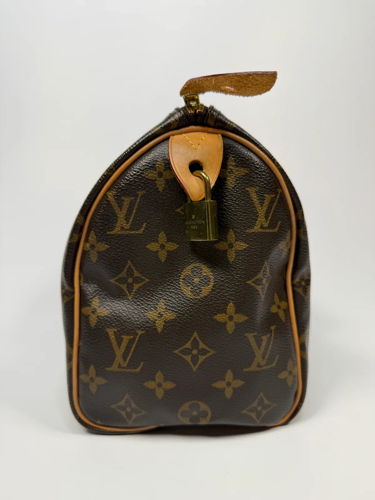Lightweight and effortlessly chic, the Speedy 25 offers a surprisingly roomy interior, making it ideal for daily essentials while maintaining a refined, feminine shape. This classic piece embodies the heritage, craftsmanship, and enduring style of Louis Vuitton. There is signs of wear to the handle and there is tarnish to the padlock and comes without the keys.