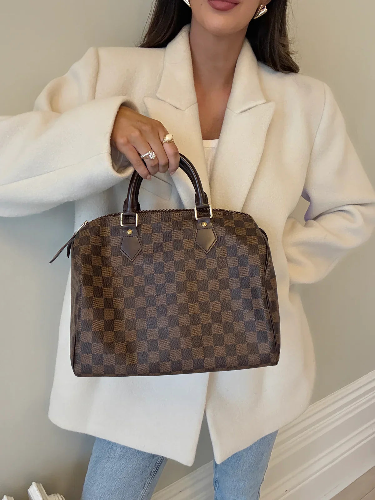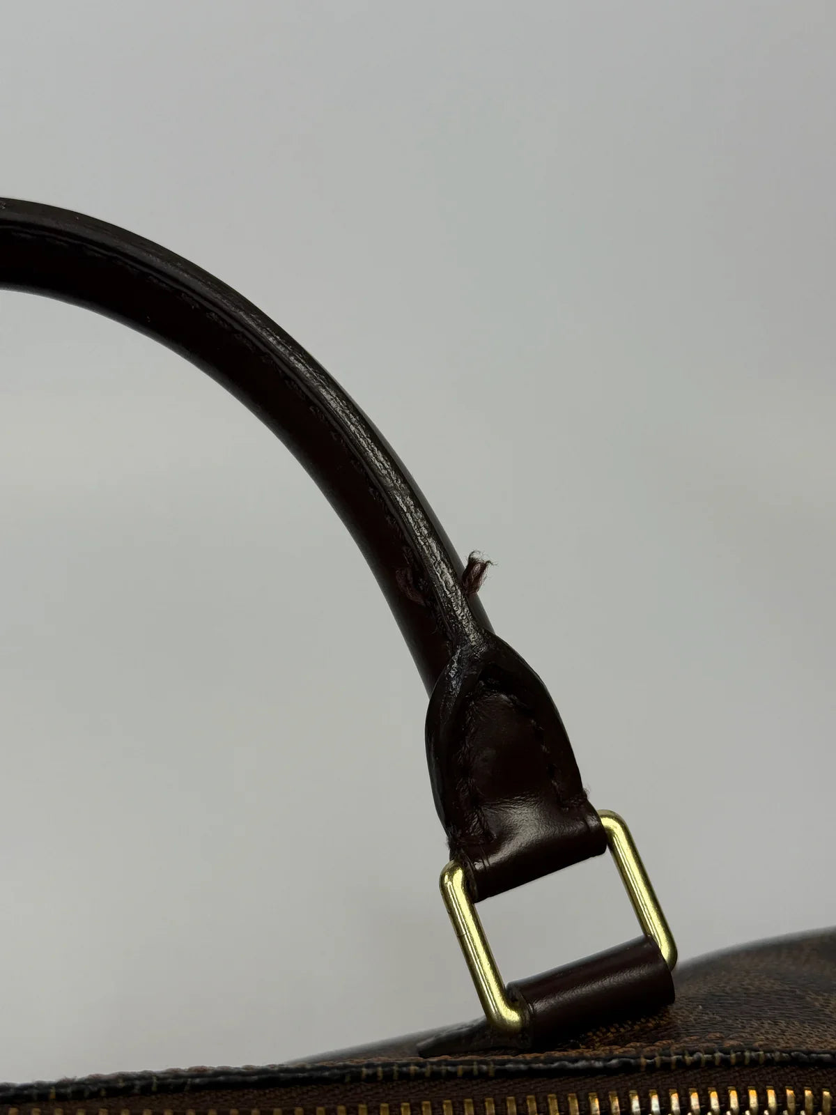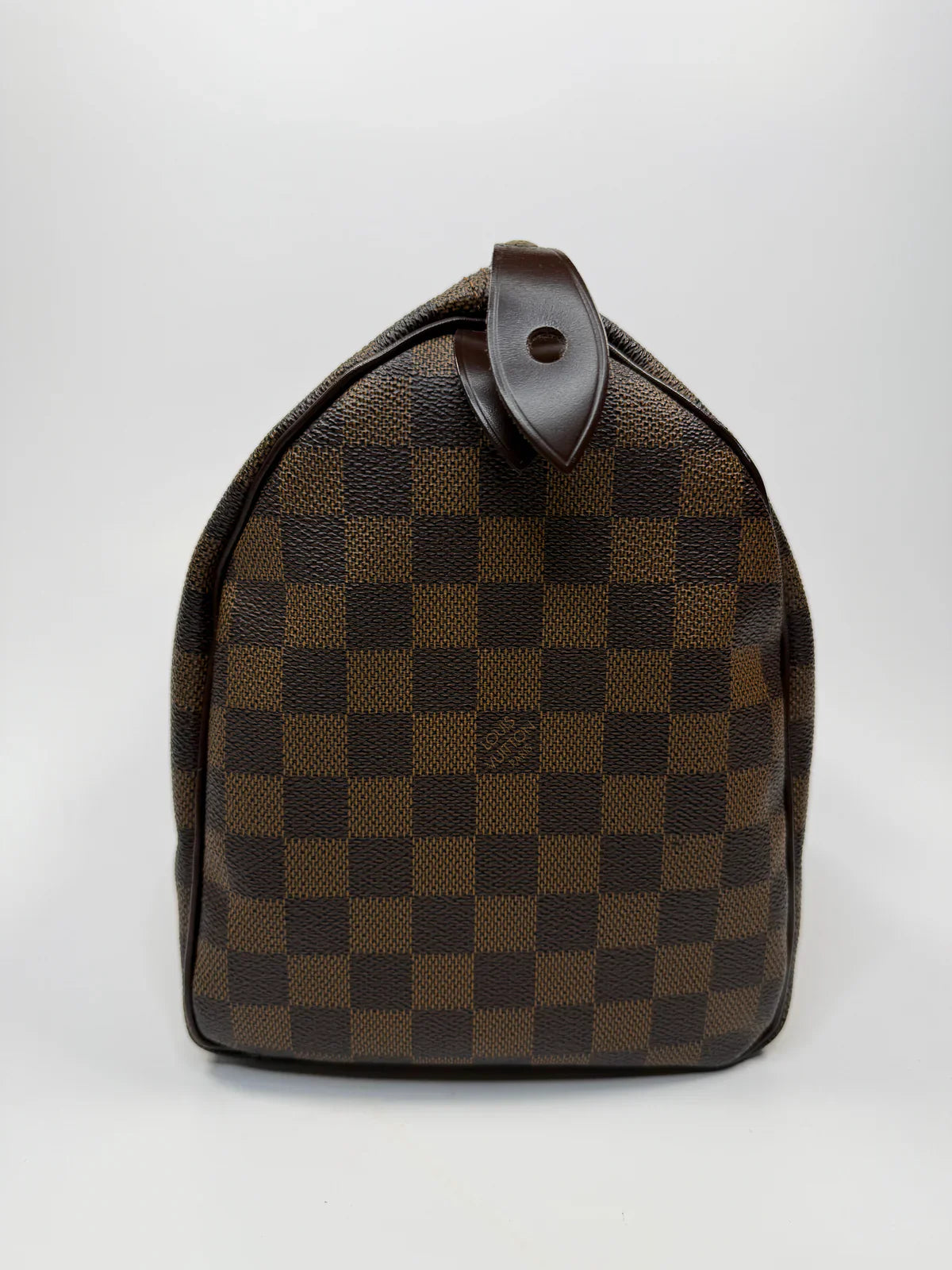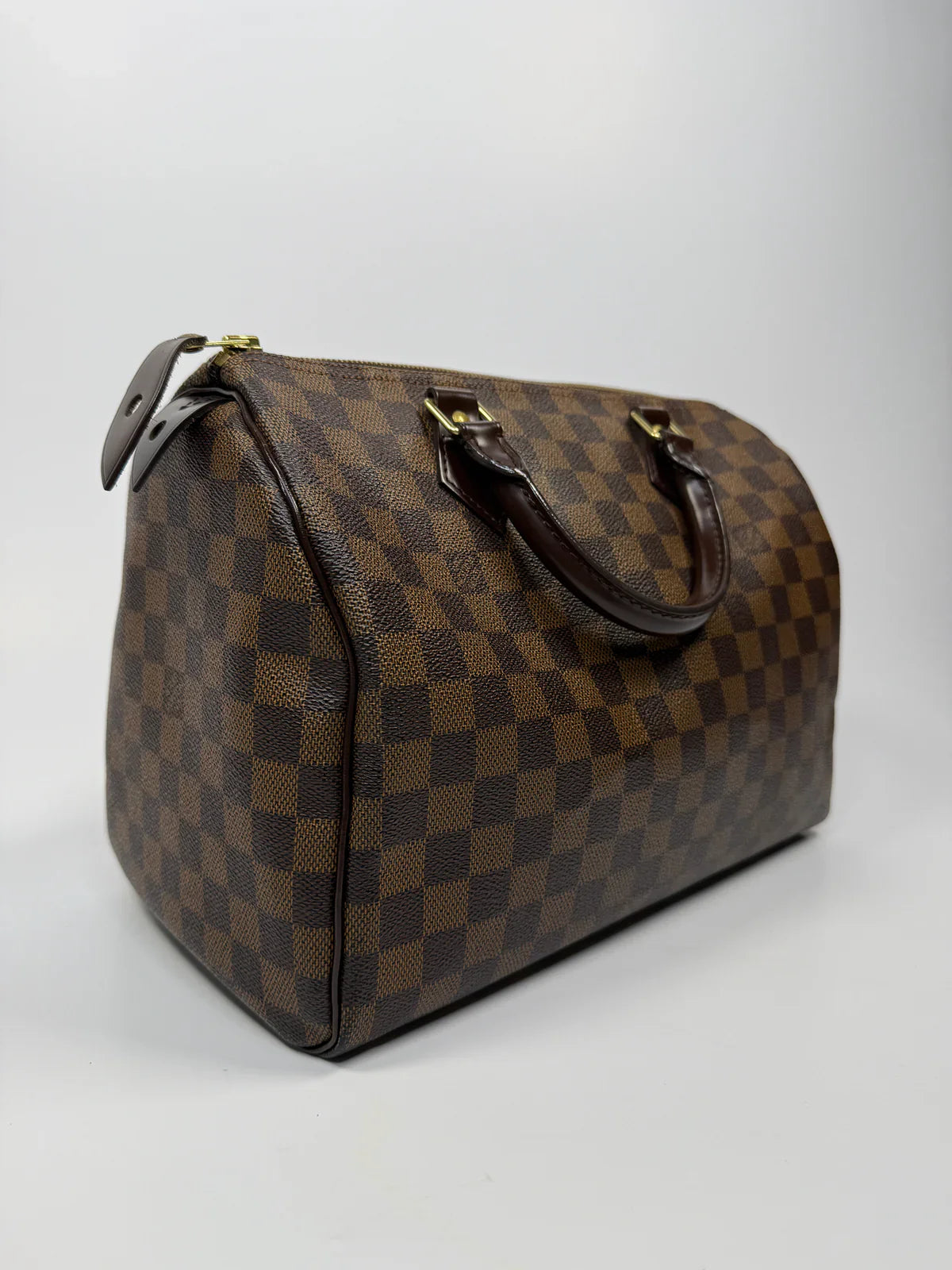 Crafted from graphic Damier Ebene canvas, the Speedy 30 is an elegant, compact handbag, a stylish companion for city life. Launched in 1930 as the "Express" and inspired by that era's rapid transit, today’s updated Speedy remains a timeless House icon, with its unmistakable silhouette and rolled leather handles. This bag comes without its key and lock. There is slight wear to the corners, some marks to the interior and fraying to the handles (see photos)