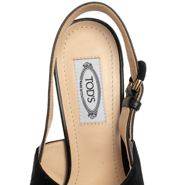 Step into elegant comfort with these Tod’s Black Suede and Leather Slingback Sandals. Crafted in Italy with smooth leather and rich suede, they feature crisscross straps, open toes, and a sturdy 9 cm block heel. The gold-tone buckle adds a subtle luxe finish, making them perfect for dressing up your day-to-night looks.